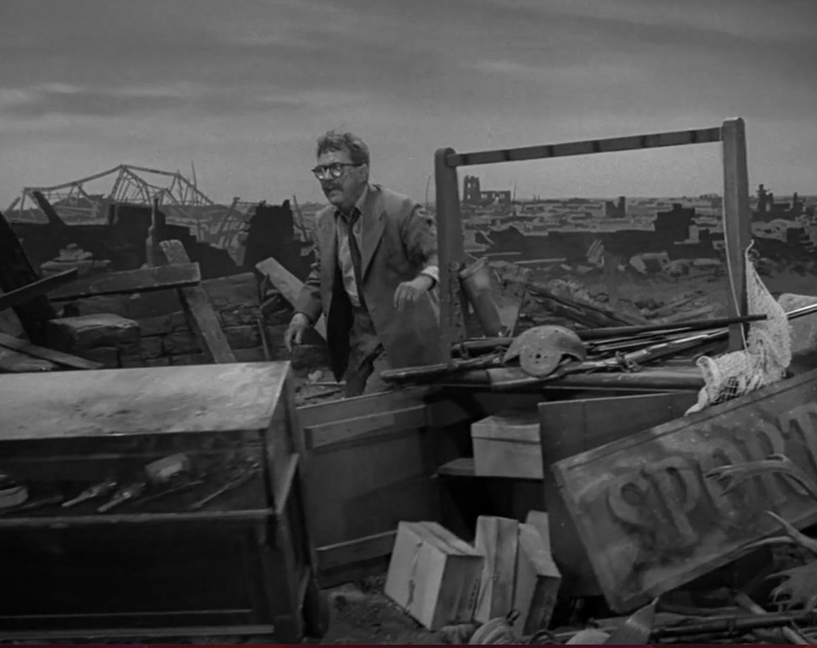Henry’s desire to be left alone to read leads him to seek solitude in the vault of the bank he works in, so that he can catch up on his novels during the day. Henry’s habit of hiding in the vault unintentionally saves his life when war breaks out and the country is leveled by bombing raids. Henry Bemis emerges from the ruins of the bank to find everyone dead and the city destroyed. His wife, his friends, the bank, the town, all gone in an instant.