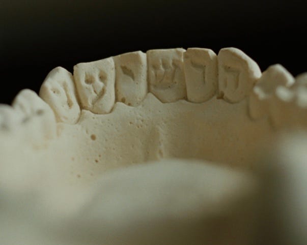 A Jewish dentist is fitting a non-Jewish patient for some dental implants and must make a mold of his teeth. When the mold dries, he notices something quite strange. The back of the man’s lower row of teeth appear to have Hebrew letters etched into them.