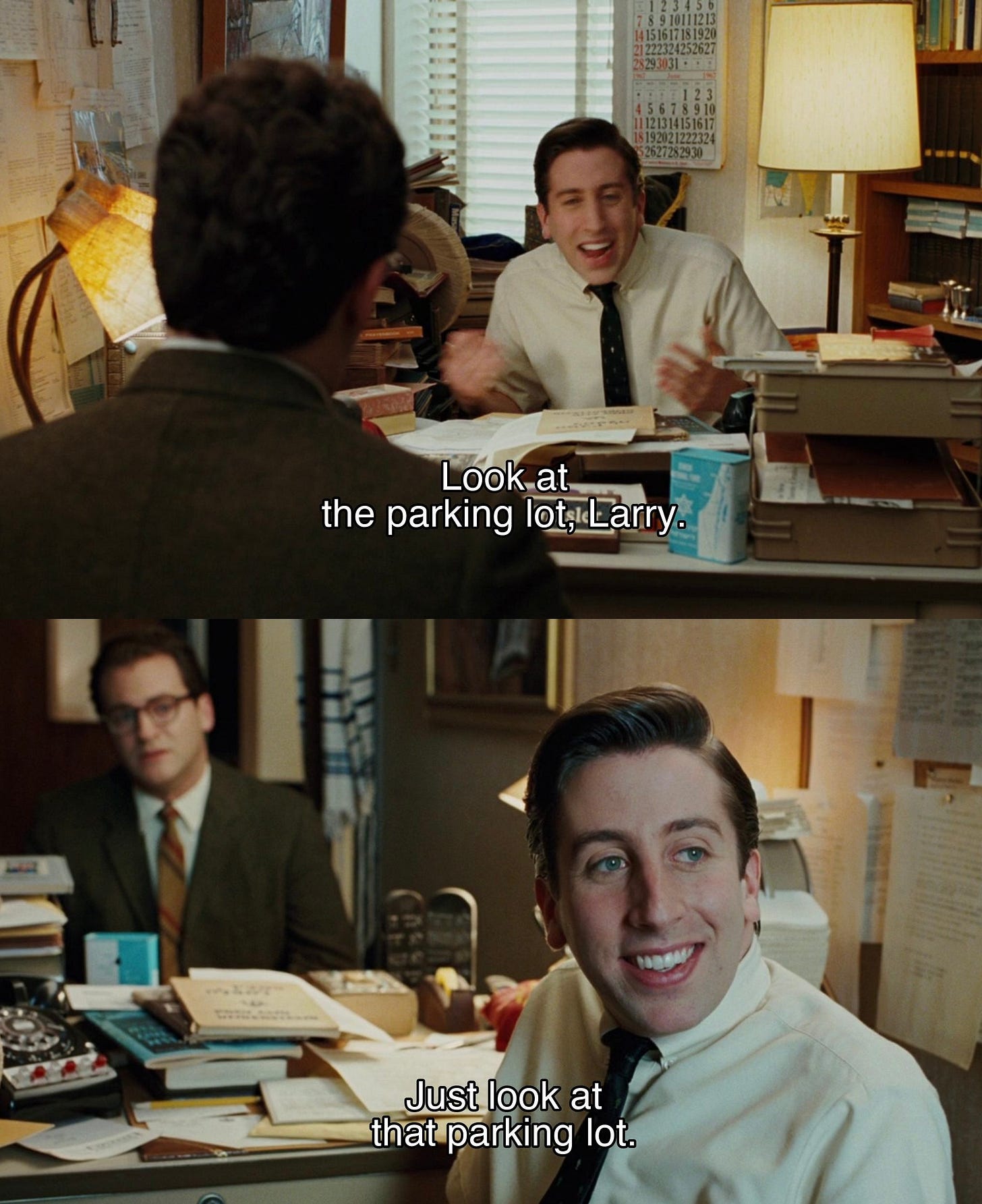 The junior rabbi urges Larry to take note of and admire the gifts and blessings to be found in the minutiae of life and the mundane things we take for granted. He provides the parking lot outside his office window as a convenient example.